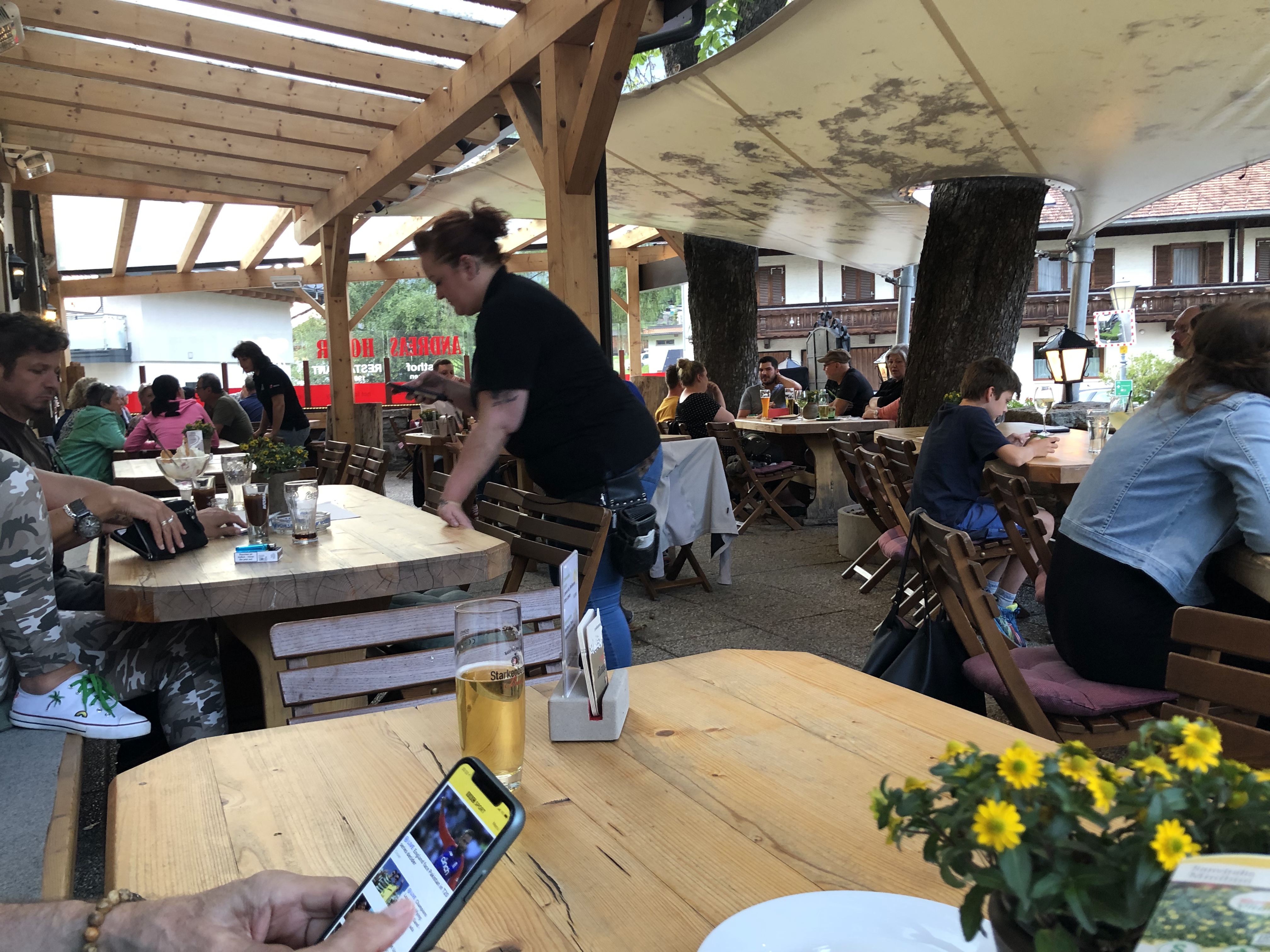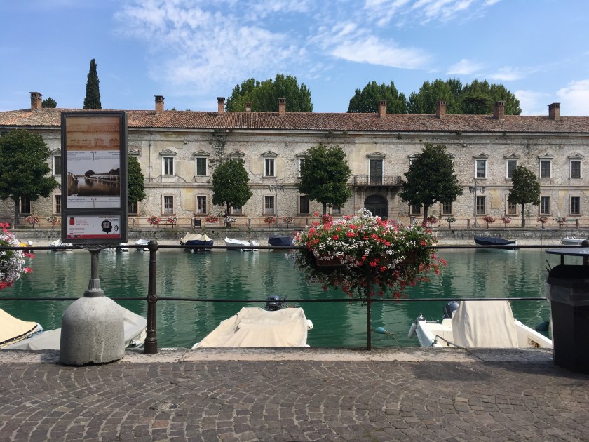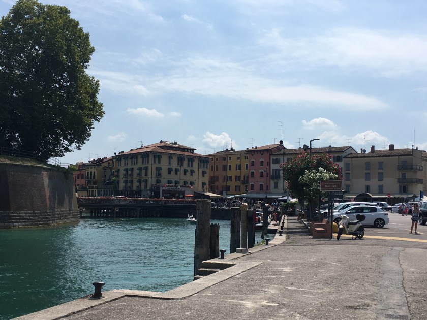 As we couldn’t get into our room until 14:30 we decided to stop at Lake Garda for lunch. We made our way to Peschiera del Garda and were parked by 11:20. It felt like mid afternoon to us, due to the early start, but most restaurants didn’t start serving lunch until 12:00. We had a bit of a wander and at 11:45 found a restaurant overlooking the canal with tables in the shade. From here we could watch people paddle boarding and canoeing.