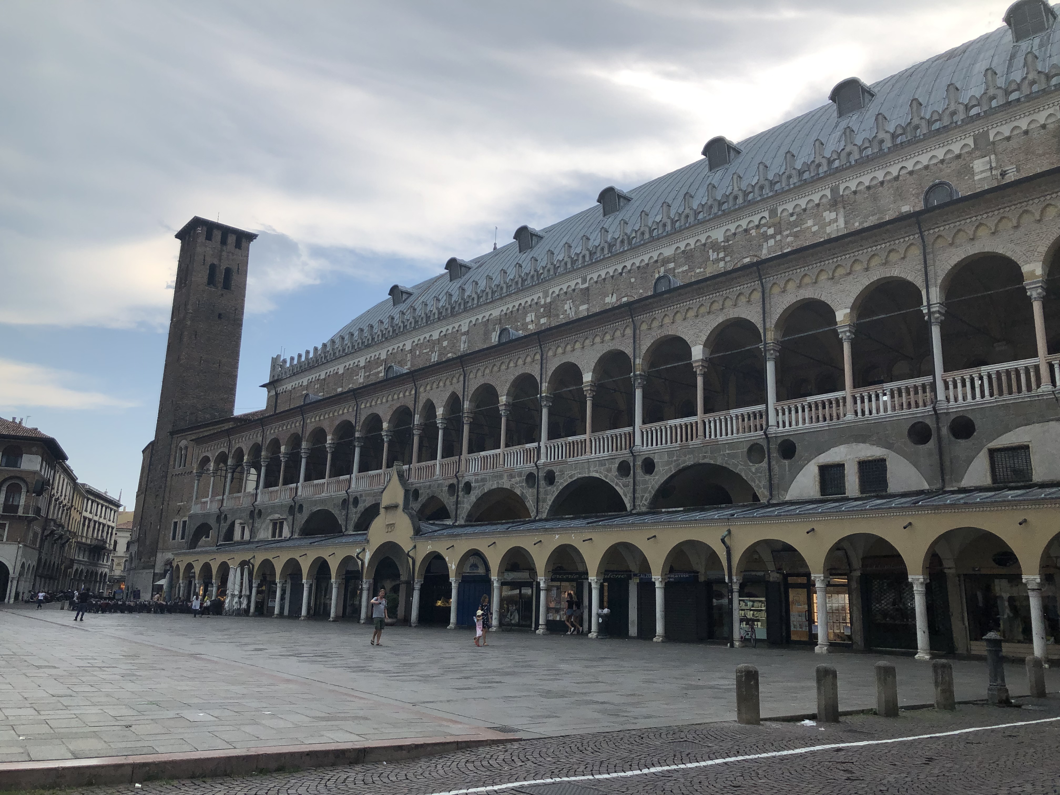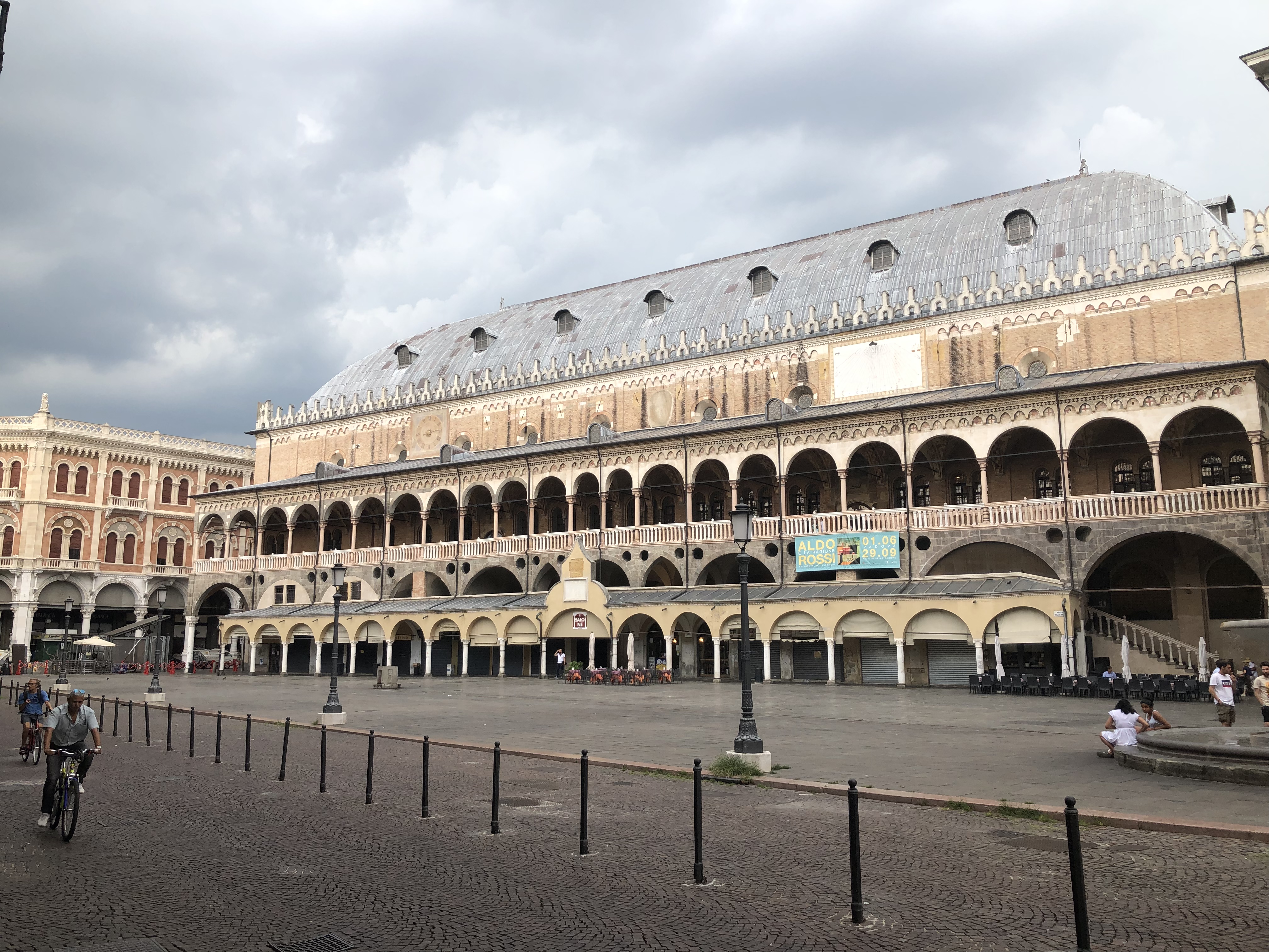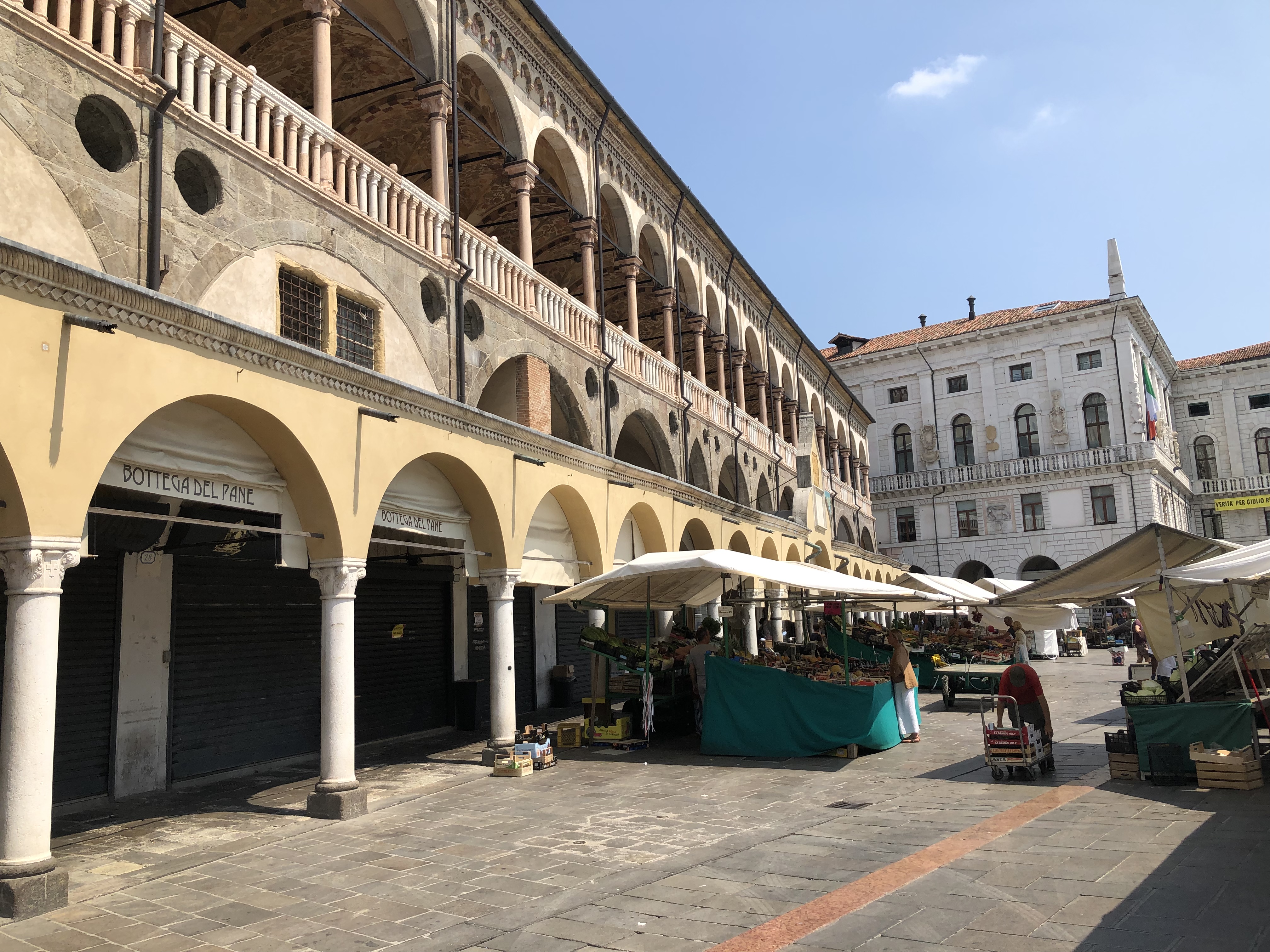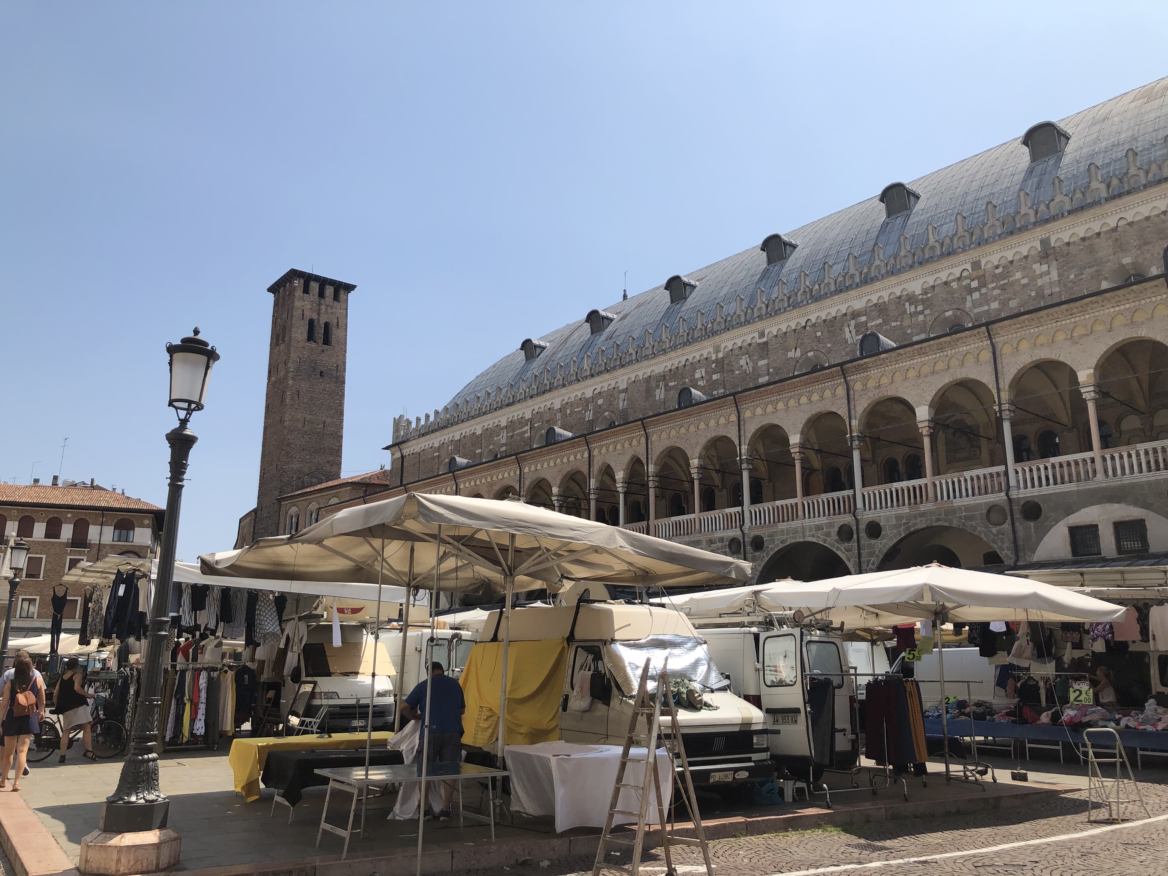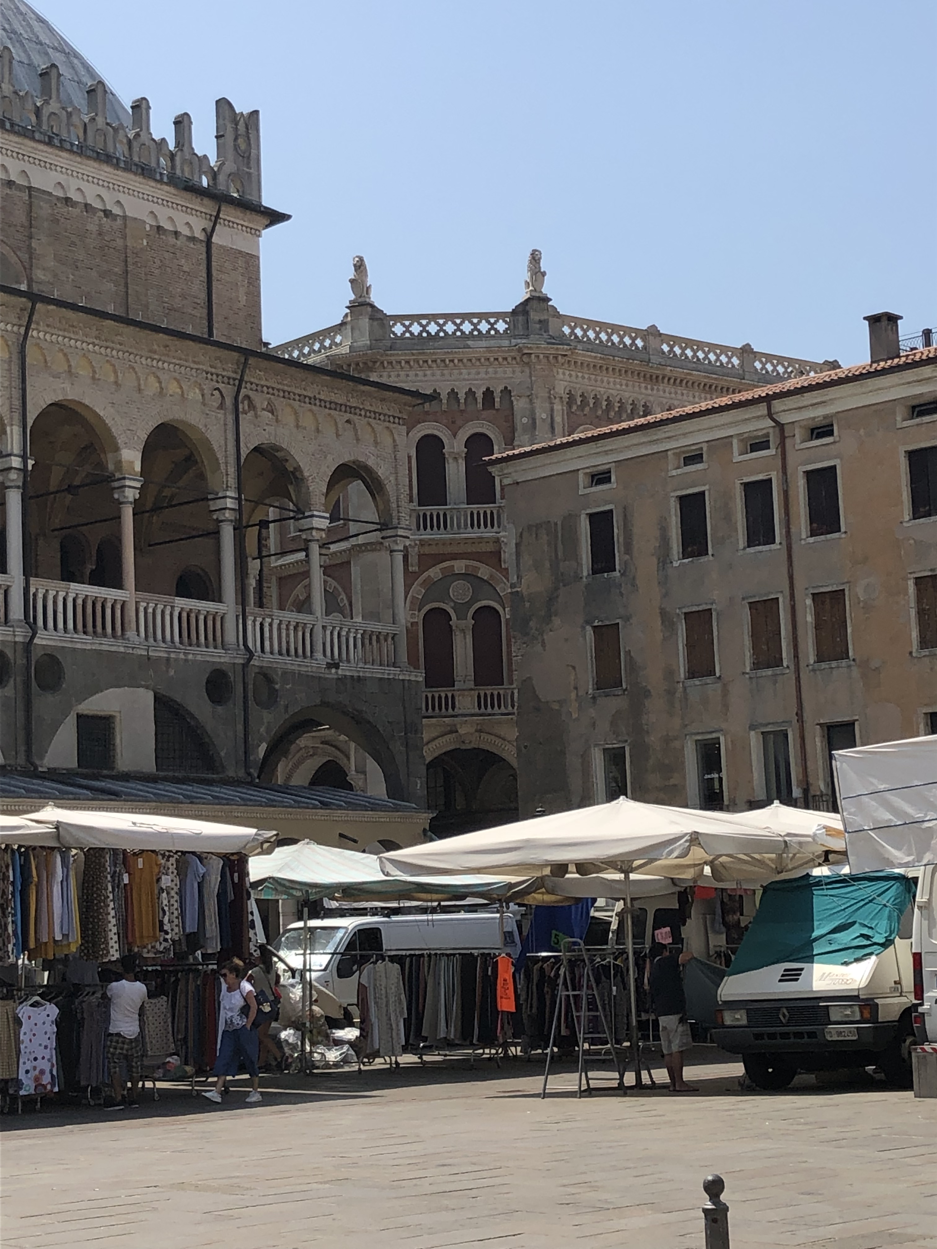 We arrived in Padua before lunch and after struggling to find somewhere to park started to wander towards the historical part of town. The daily market was still taking place so there were lots of fruit and vegetable stalls set up on one side of the Palazzo della Ragione and clothes and homeware stalls on the other side. Underneath the palazzo there were two alleyways with shops and stalls on both sides.