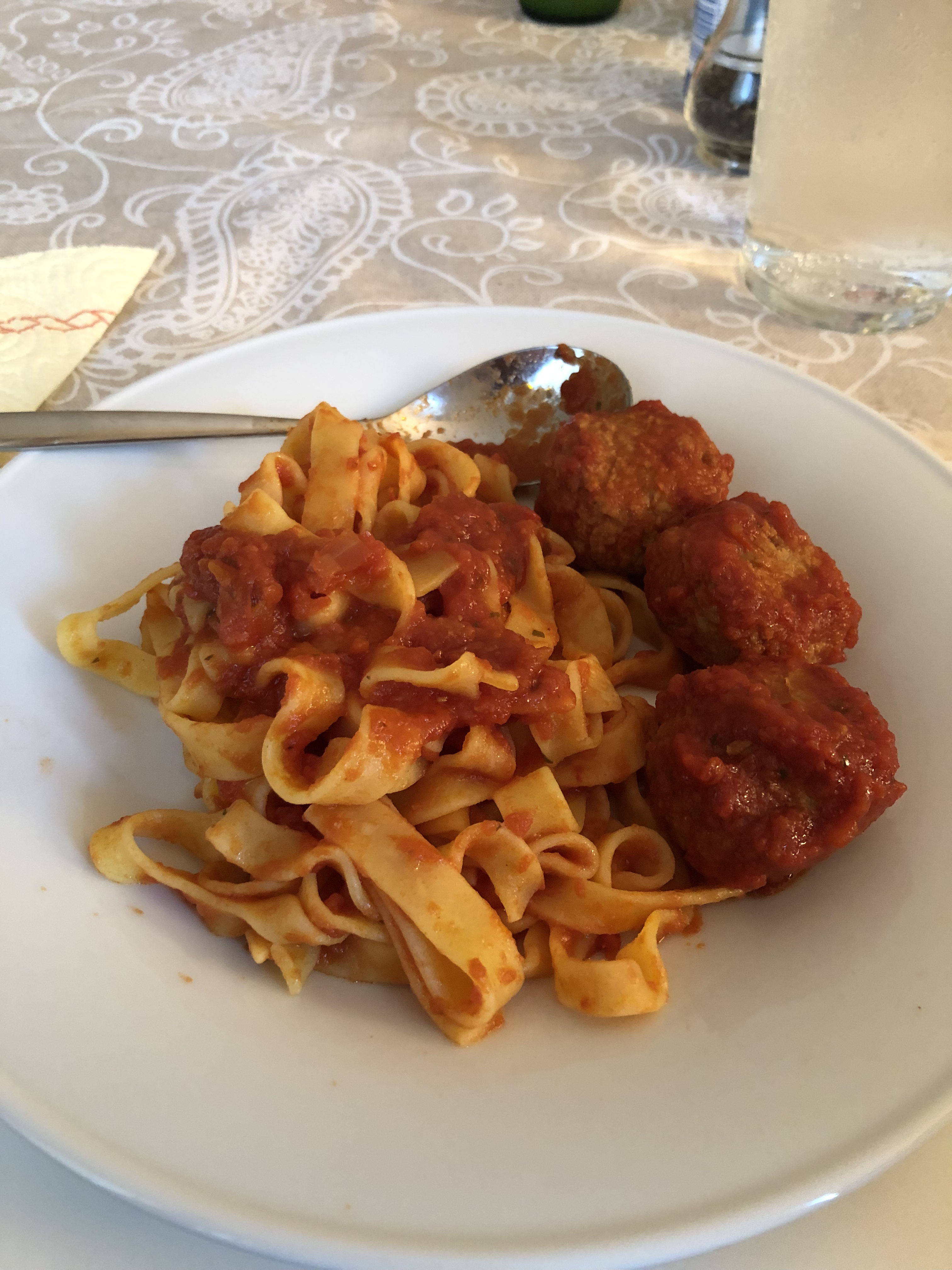 As we had bought provisions in Padua I was my turn to act as ‘mein host’ and cook dinner. It wasn’t too taxing. We had bought fresh tagliatelle and meatballs in tomato sauce with extra tomato sauce because I didn’t think there was enough sauce to coat the tagliatelle. After boiling the pasta in a large pan and heating up the meatballs and sauce in the microwave, I served up my amazing pasta creation.
