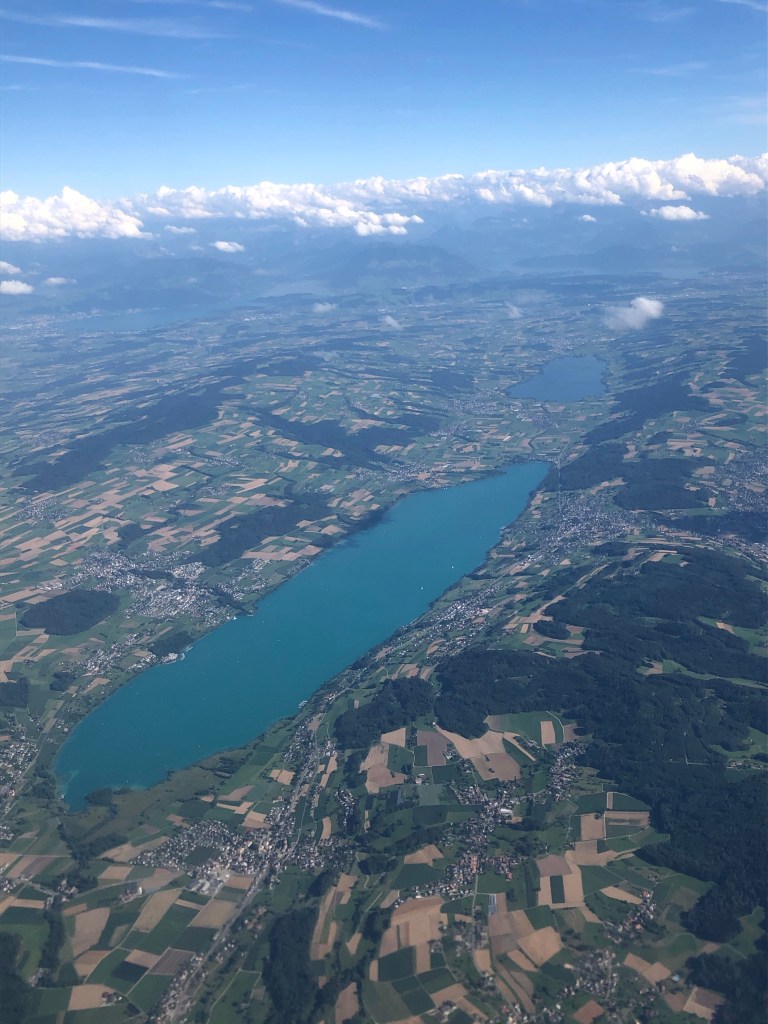 Take off view of ZΓΌrichsee top centre and Greifensee top leftAnother view to show why Switzerland is the βland of lakes and mountainsβ – Hallwilersee in the foreground with Baldeggersee behind and Zugersee top left.