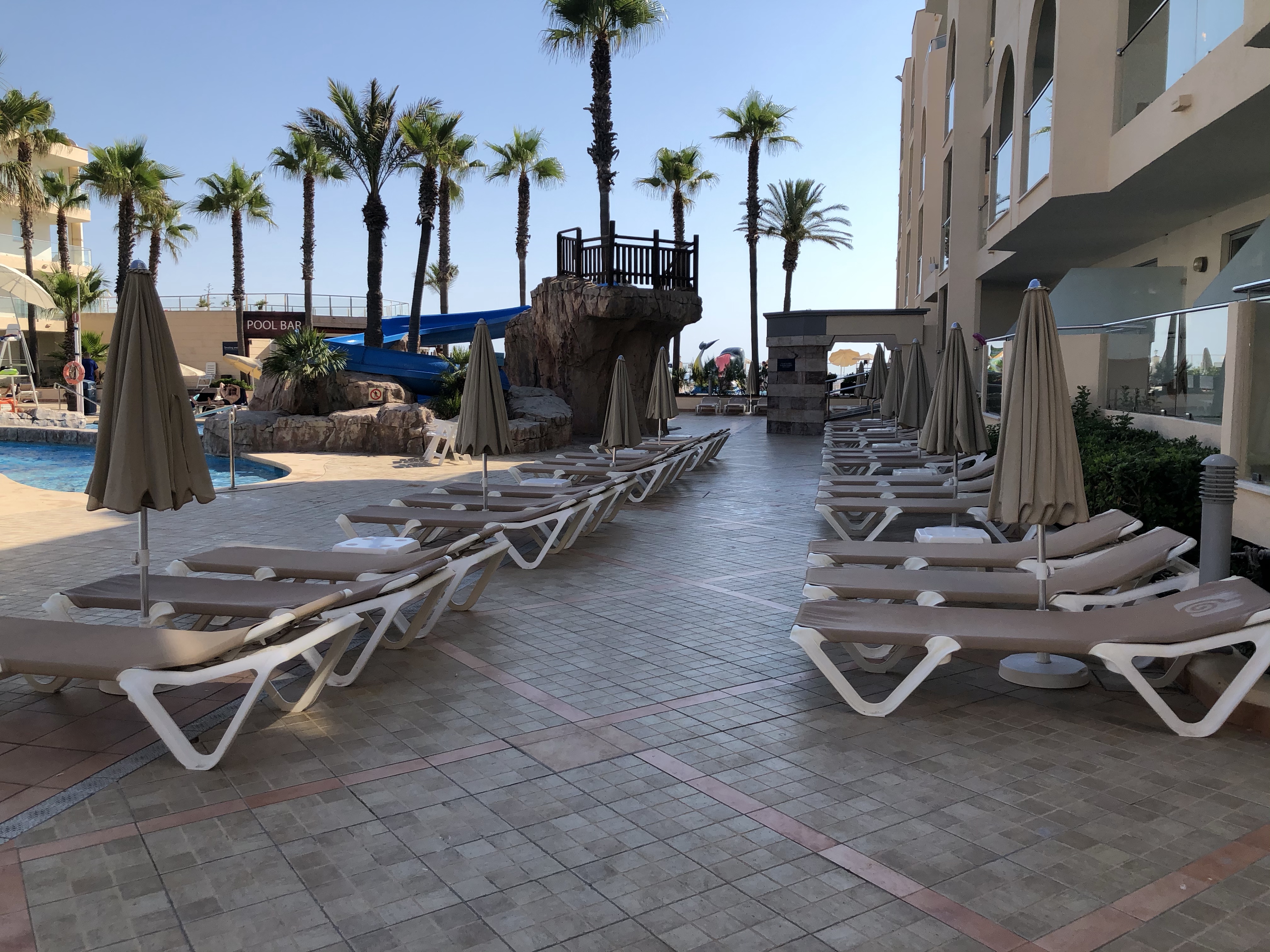 Sun bed areas marked out with tape by the activity poolMarked areas on the sun deck by the entrance to the beachPlenty of free sun beds by our building in the morningLoads of spare sun beds by the restaurant