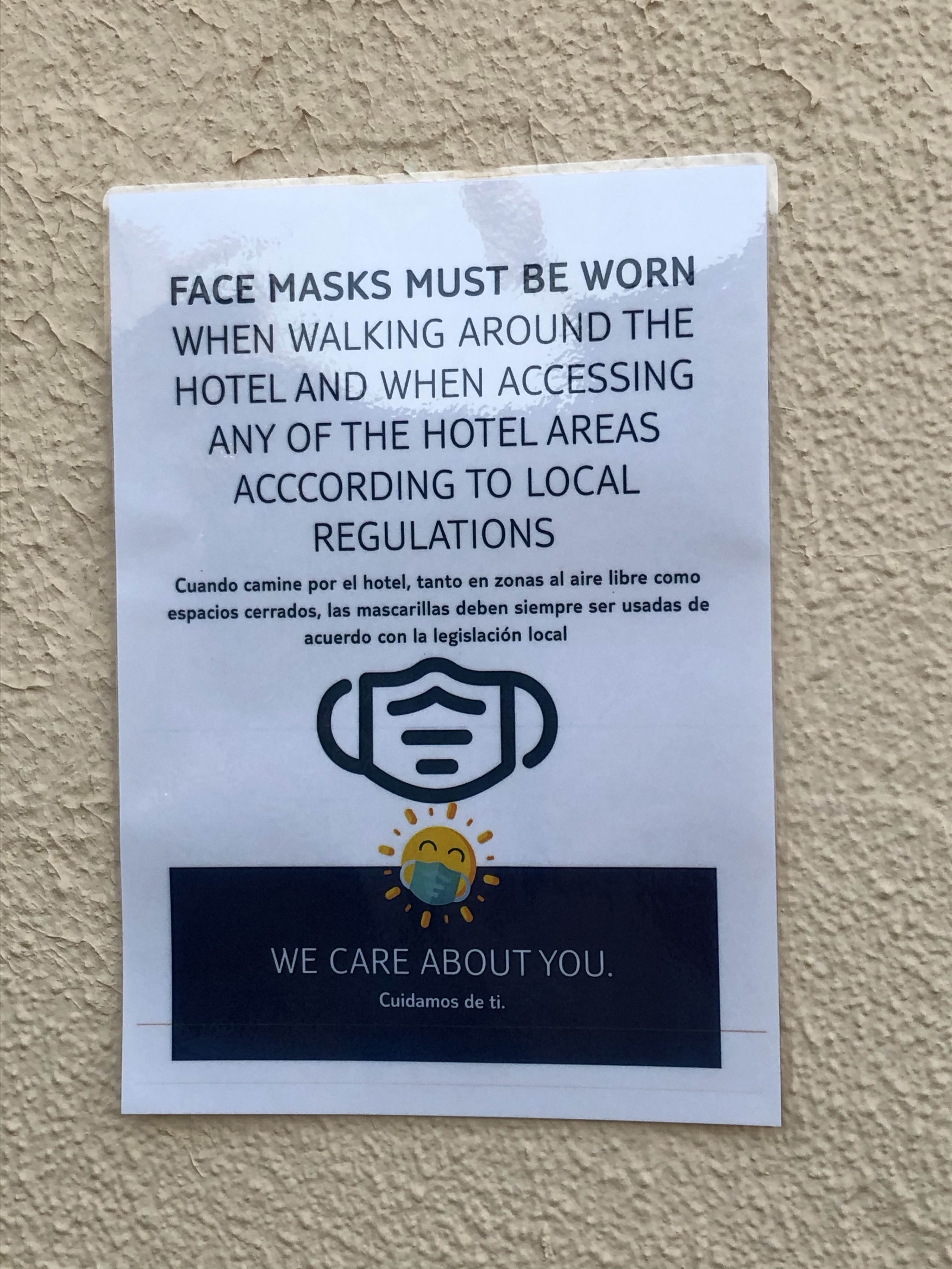 This means we have to wear our face masks when walking around the hotel, in the restaurants to be served and at the bar when ordering drinks. While seated the face mask can be removed.