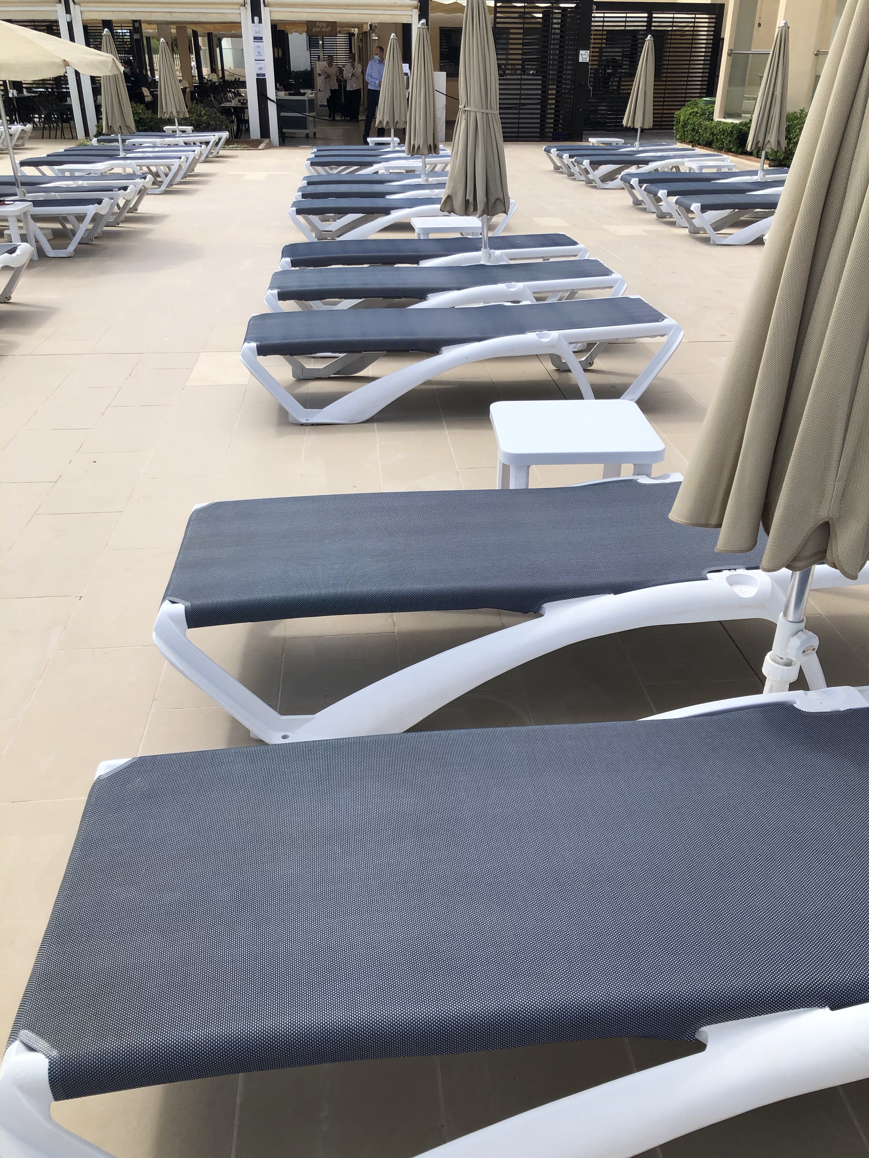 The sun beds are laid out in threes with a side table and umbrella per group. These three sun beds are in marked areas with 1.5m between groups. As the occupancy is only at 40% there are always free sun beds available all day.