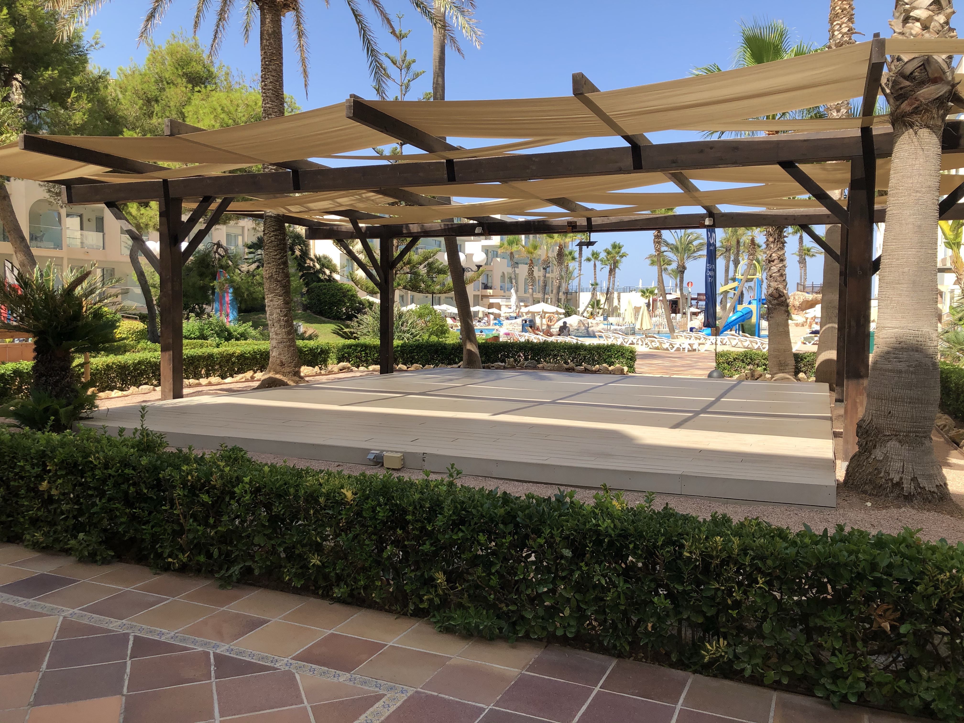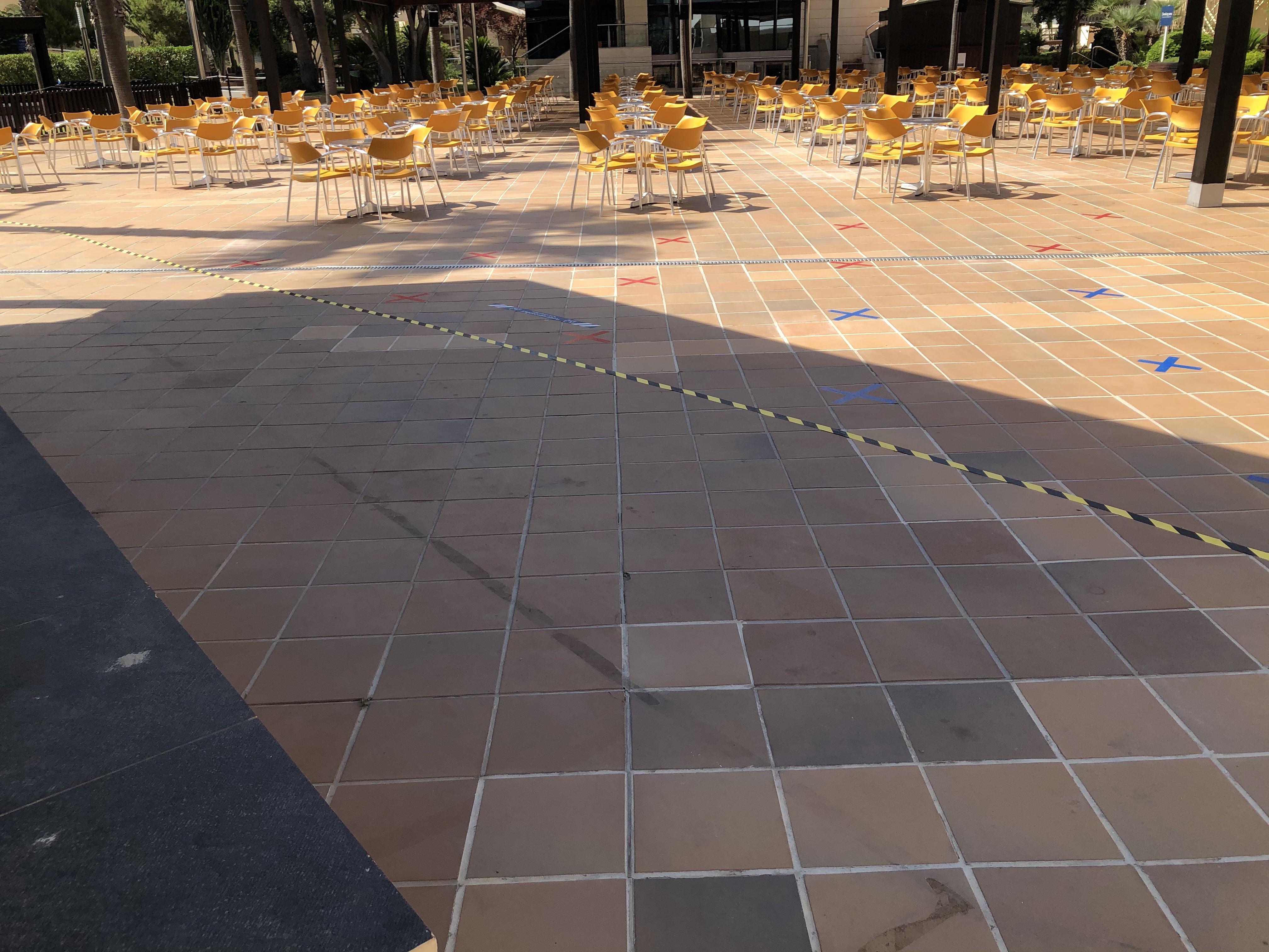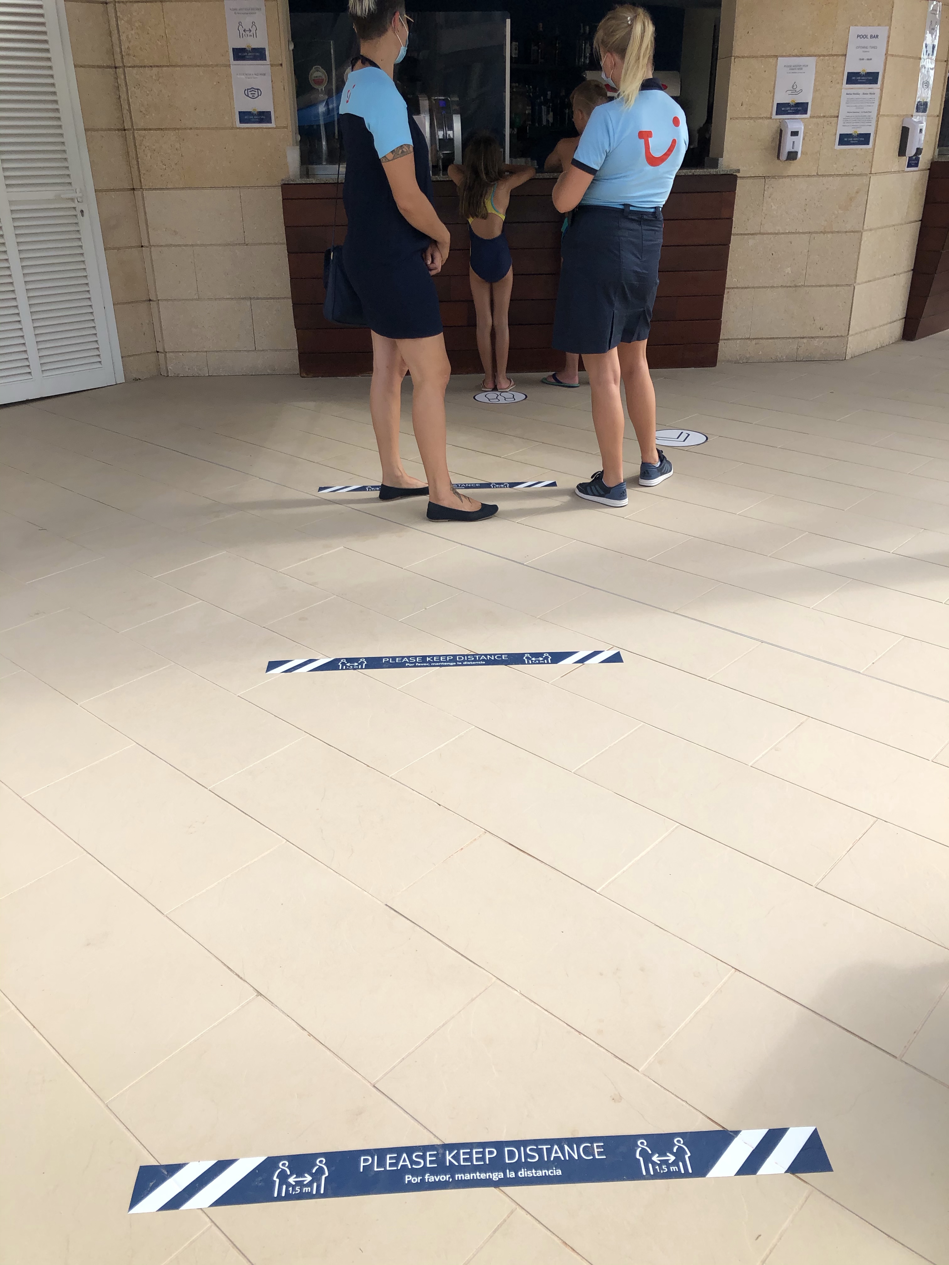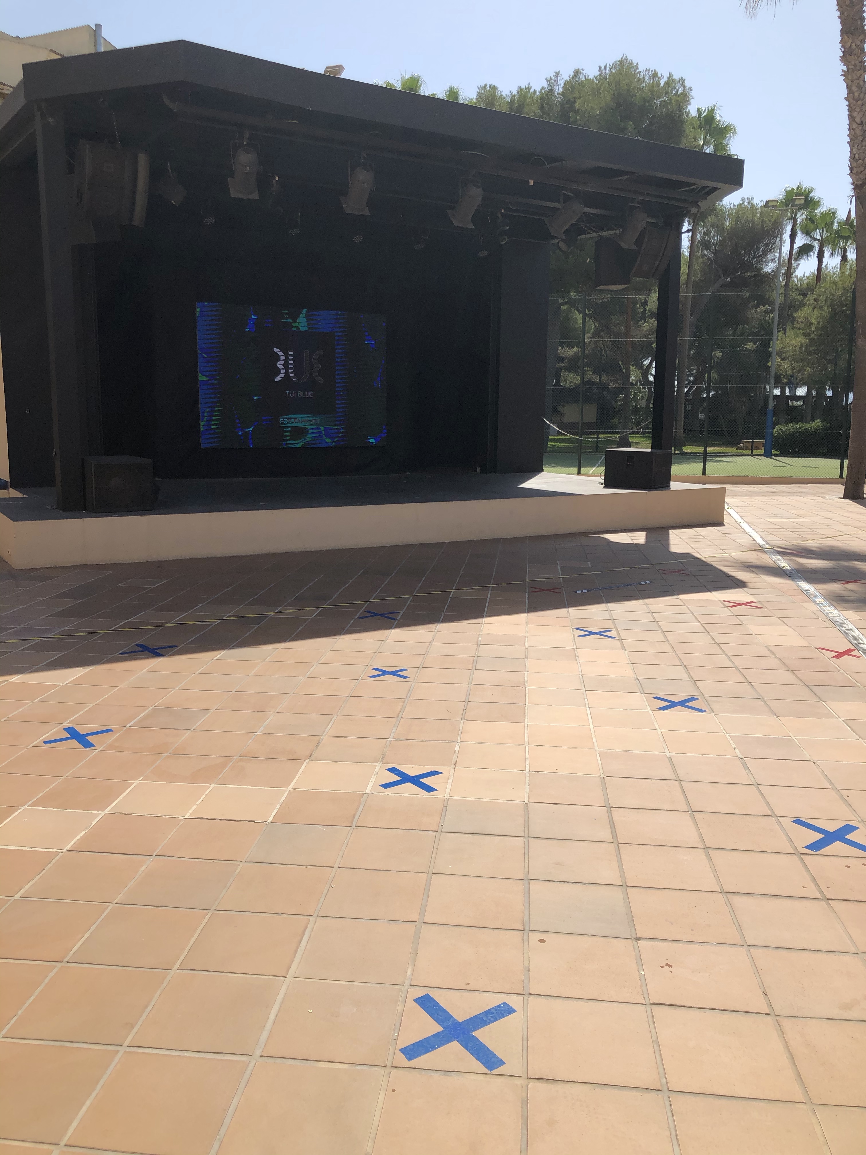 At evening entertainment there are lots of markings in front of the stage. There is an area marked within black and yellow tape which the guests are not supposed to be in. There are also crosses on the floor showing where people can stand to dance during the disco section. TUI guides tend to patrol this area to ensure that social distance is maintained.
