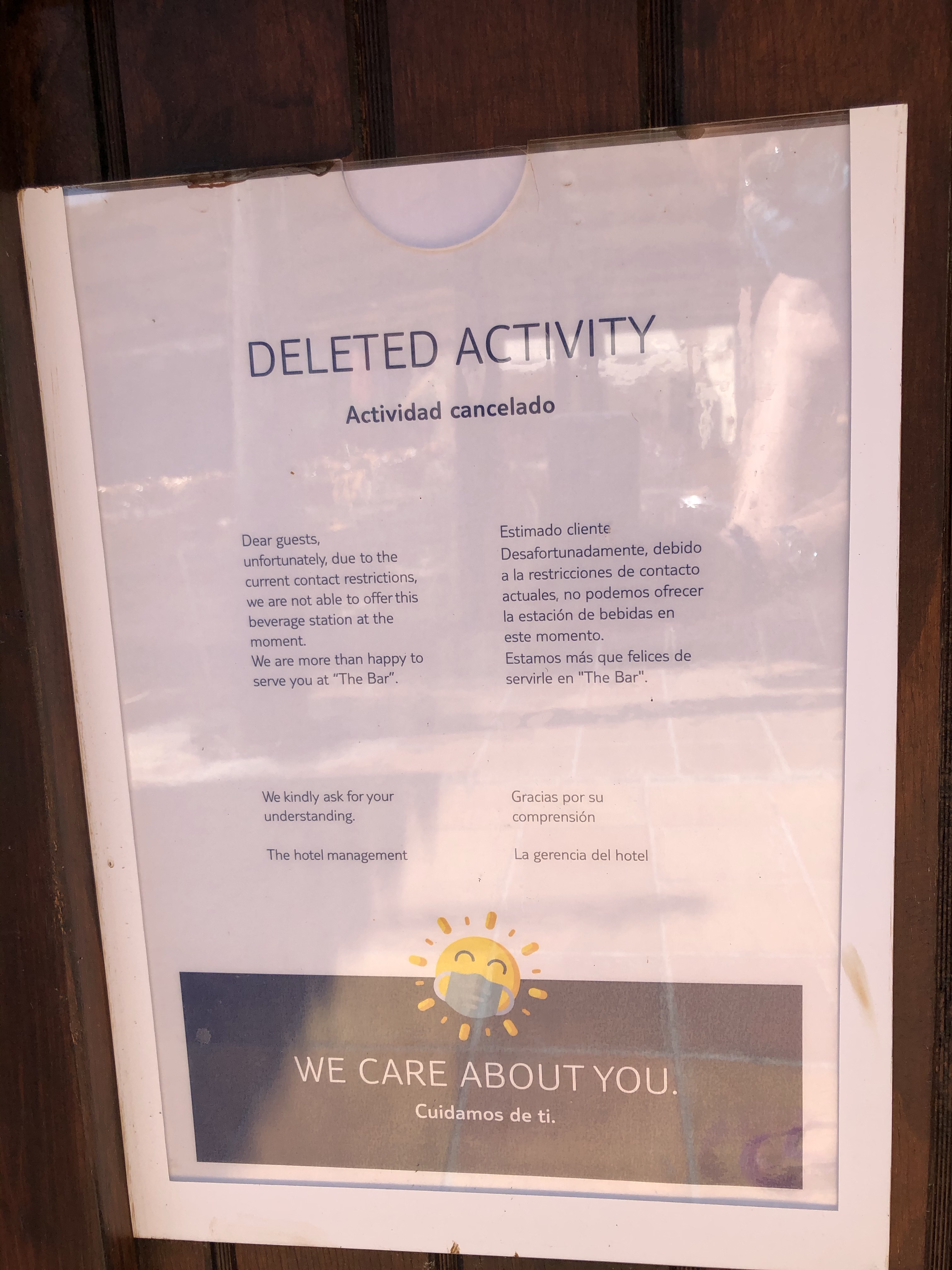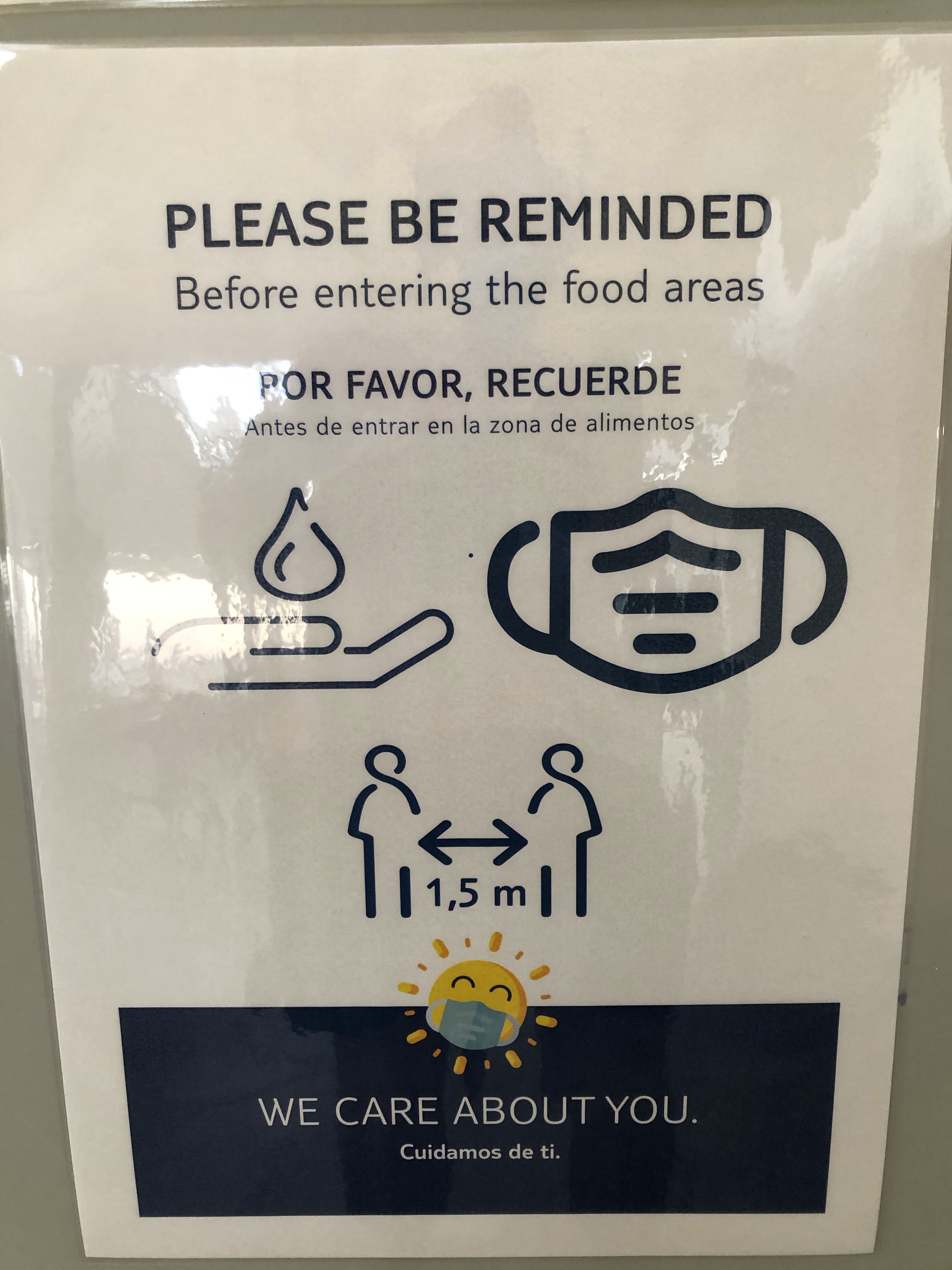 Hand sanitiser is available everywhere around the hotel – entrances to restaurants, by all the bars, by all entrances to reception, by the entrances to the blocks of rooms. We are encouraged to use it while waiting to be seated in the restaurants and at the bars. They are regularly replenished.