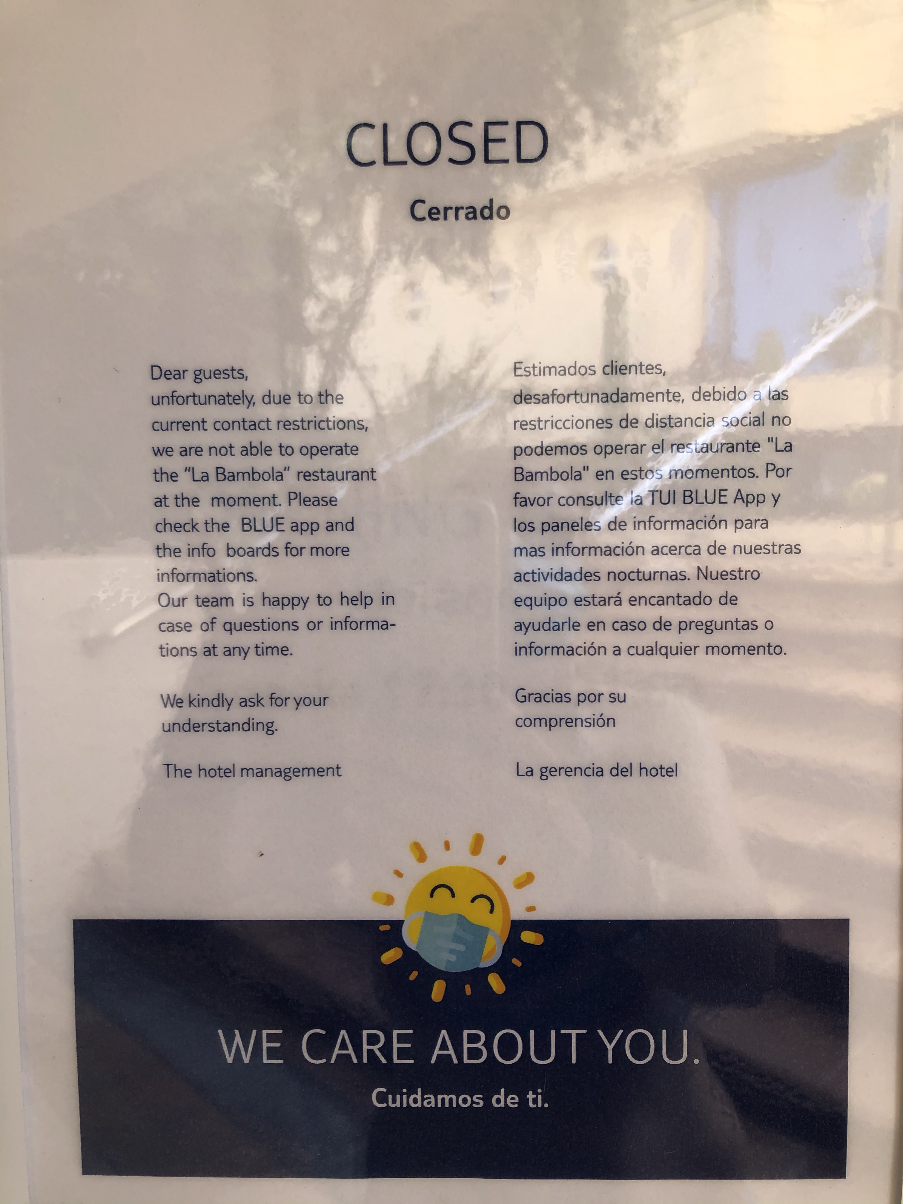 There is one main restaurant open instead of two. The Spanish speciality restaurant is only open on Wednesdays and Thursdays. We’ve booked for Wednesday and expect it to be busy.