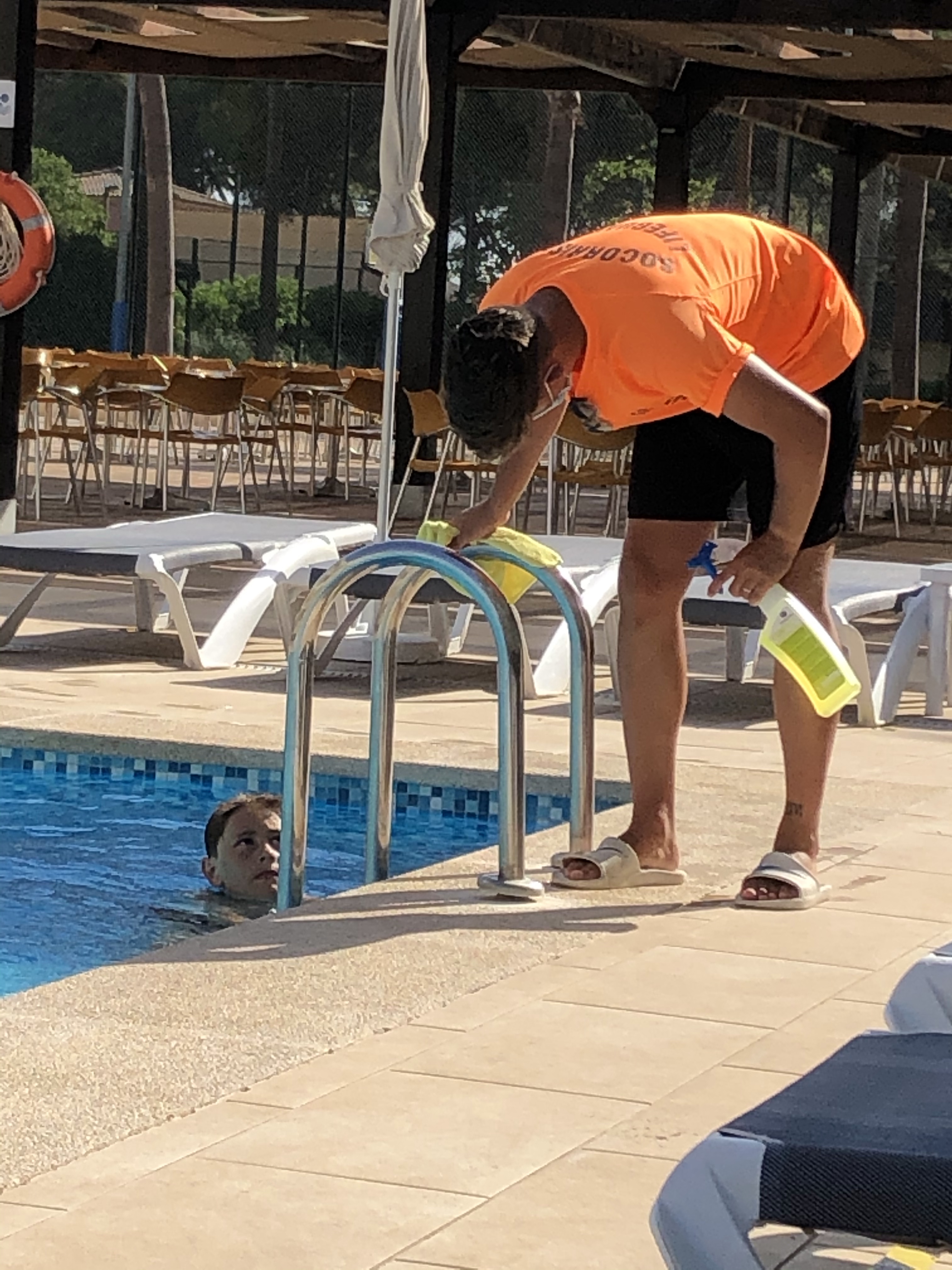 Yesterday we were sitting by the activity pool and the lifeguard was cleaning the handrails by the steps with disinfectant every thirty minutes.