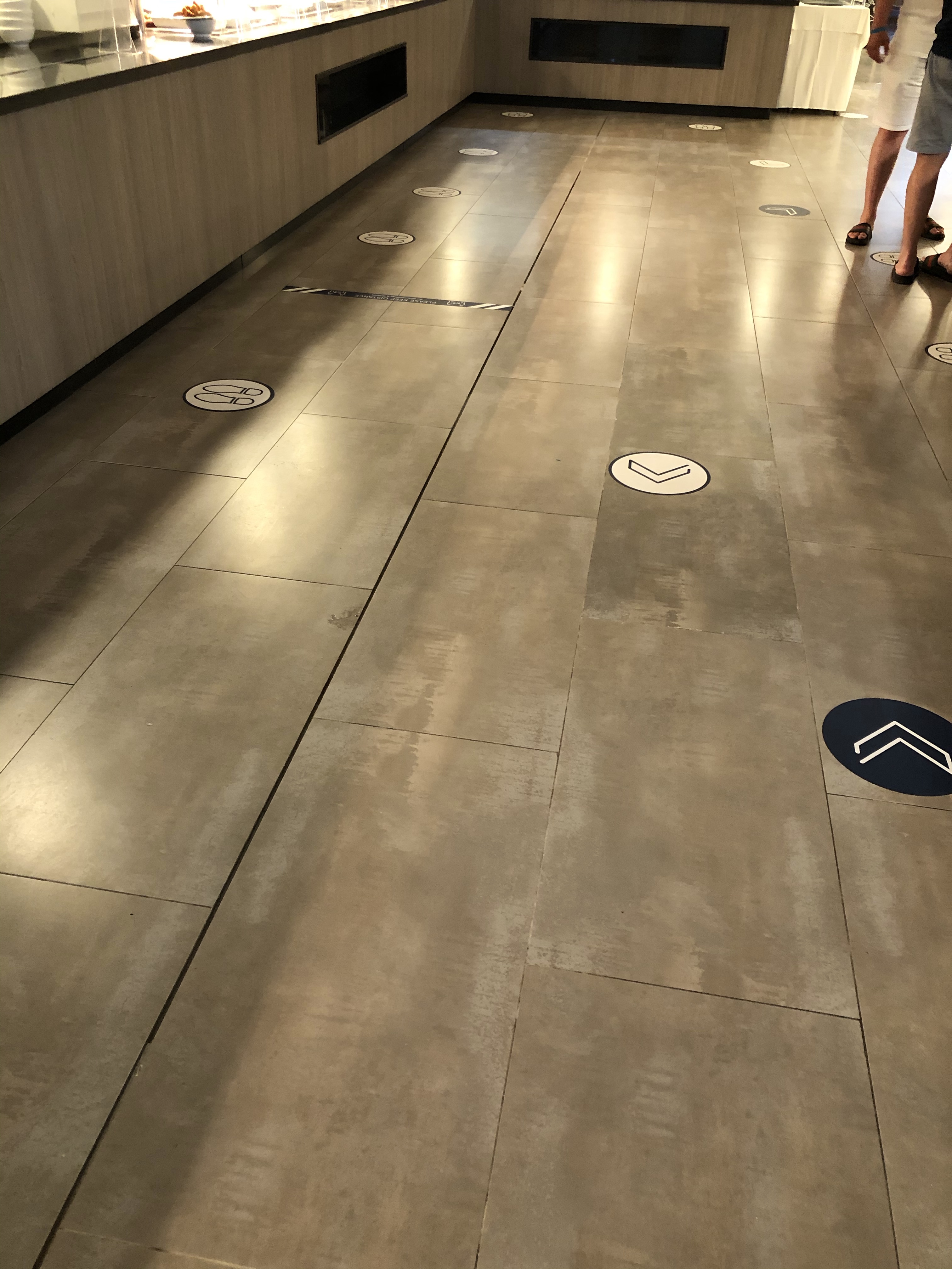 Clearly marked entrance and exit to the serving area of the restaurant Sign by the entrance to the food serving areaFloor markings showing where to stand and in which direction to walk