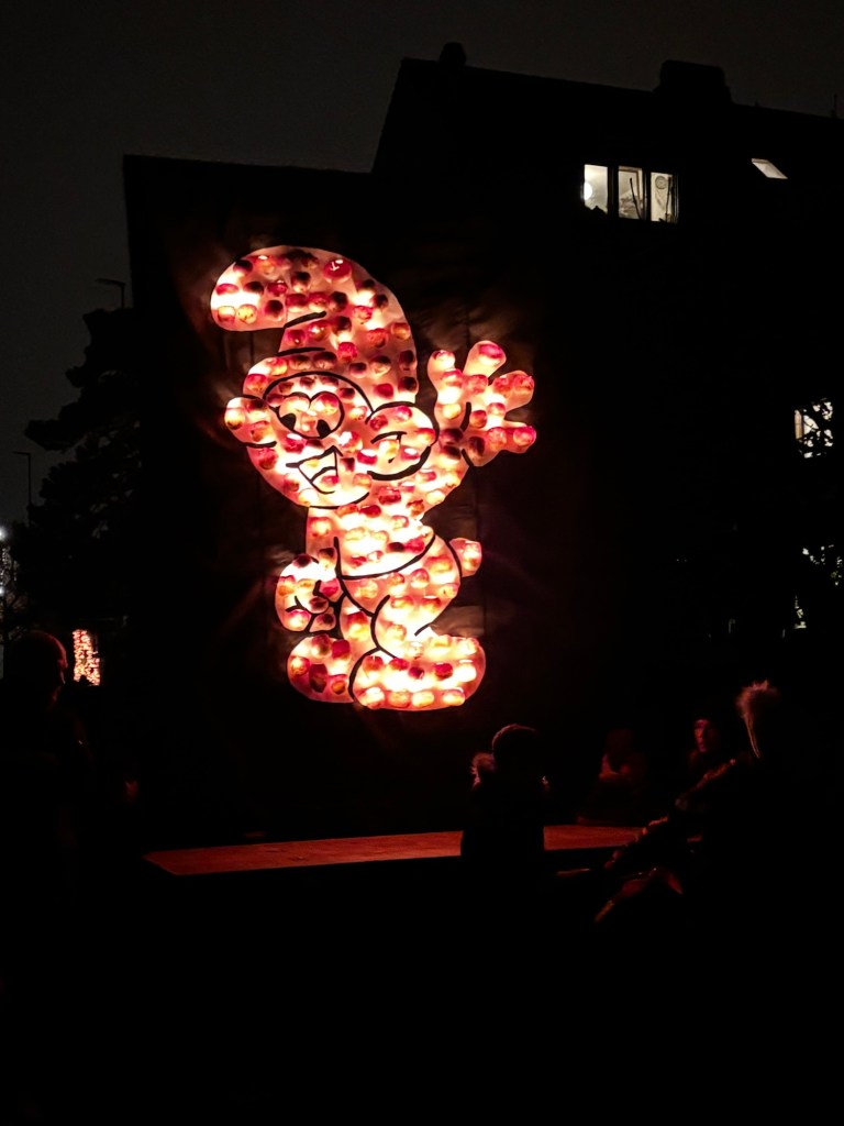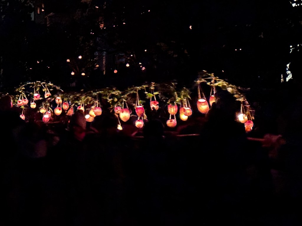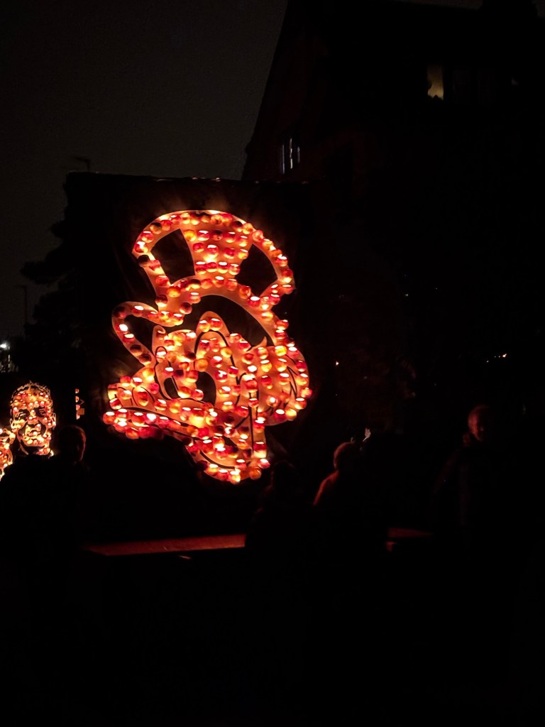 At 5:55pm there was a loud bang and a firework was launched into the sky. As it exploded all the streetlights went out, to allow us to see the lanterns better.