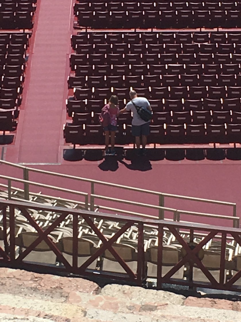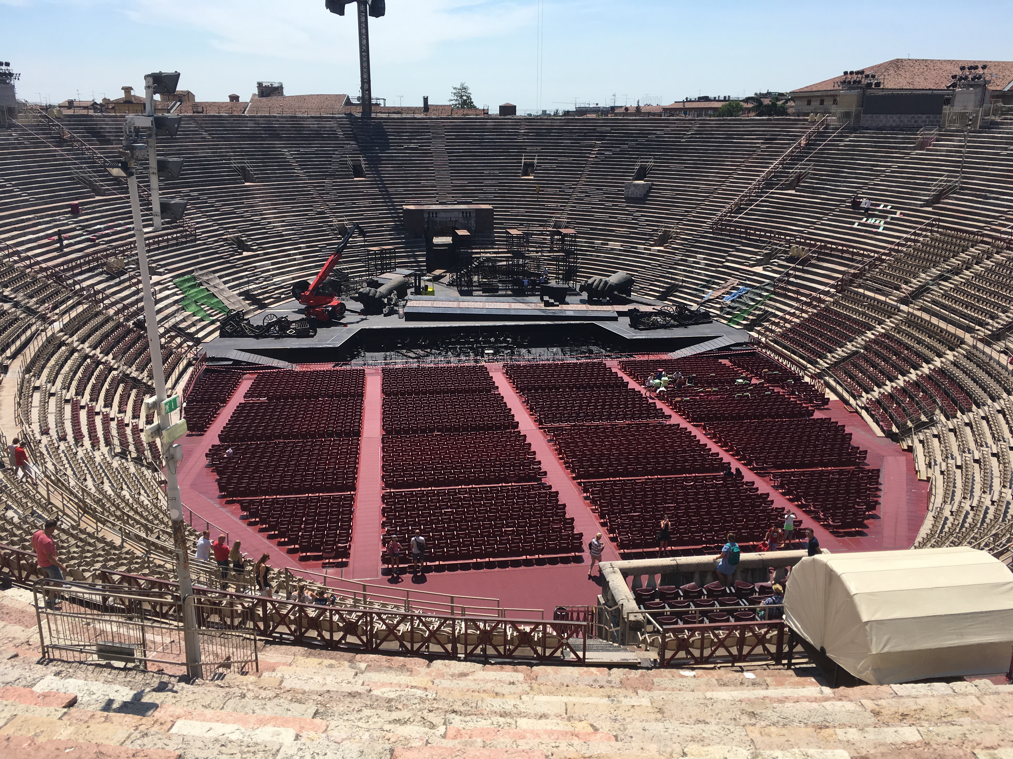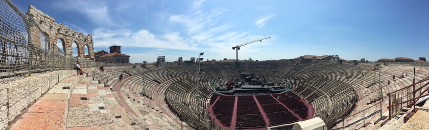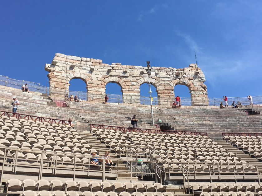 We followed our guidebook’s recommendation and headed next to Piazza Bra and the Arena. Verona has an opera festival in the Arena every year but the amphitheatre was originally completed in around AD 30 and was the third largest in the world. It was used for mock battles and gladiatorial combats but in more recent times it has also been used for public executions, fairs, theatre performances, bull fighting and bingo. It is currently set up for the opera season so the staging and seating is in place. It did not make it any less amazing, thinking about when it was built and how it has survived.