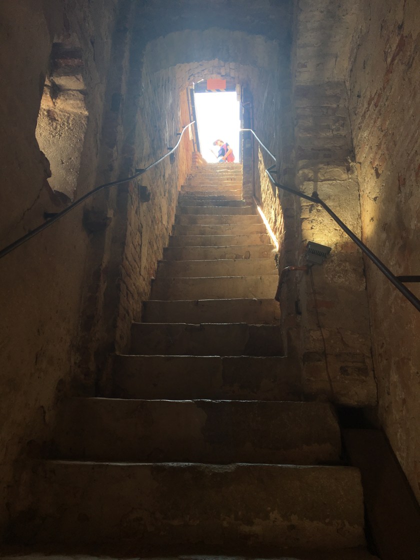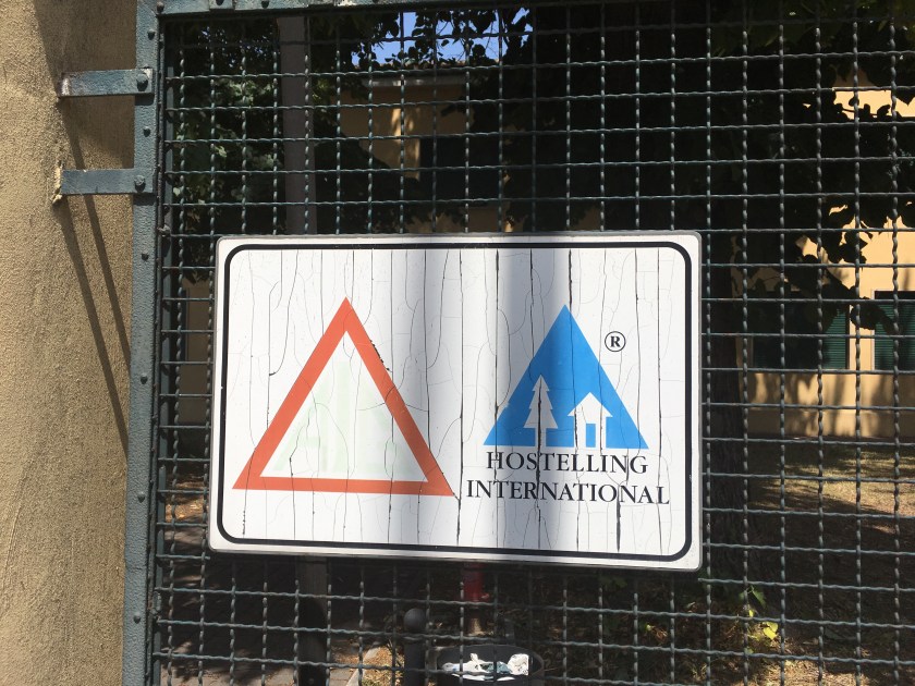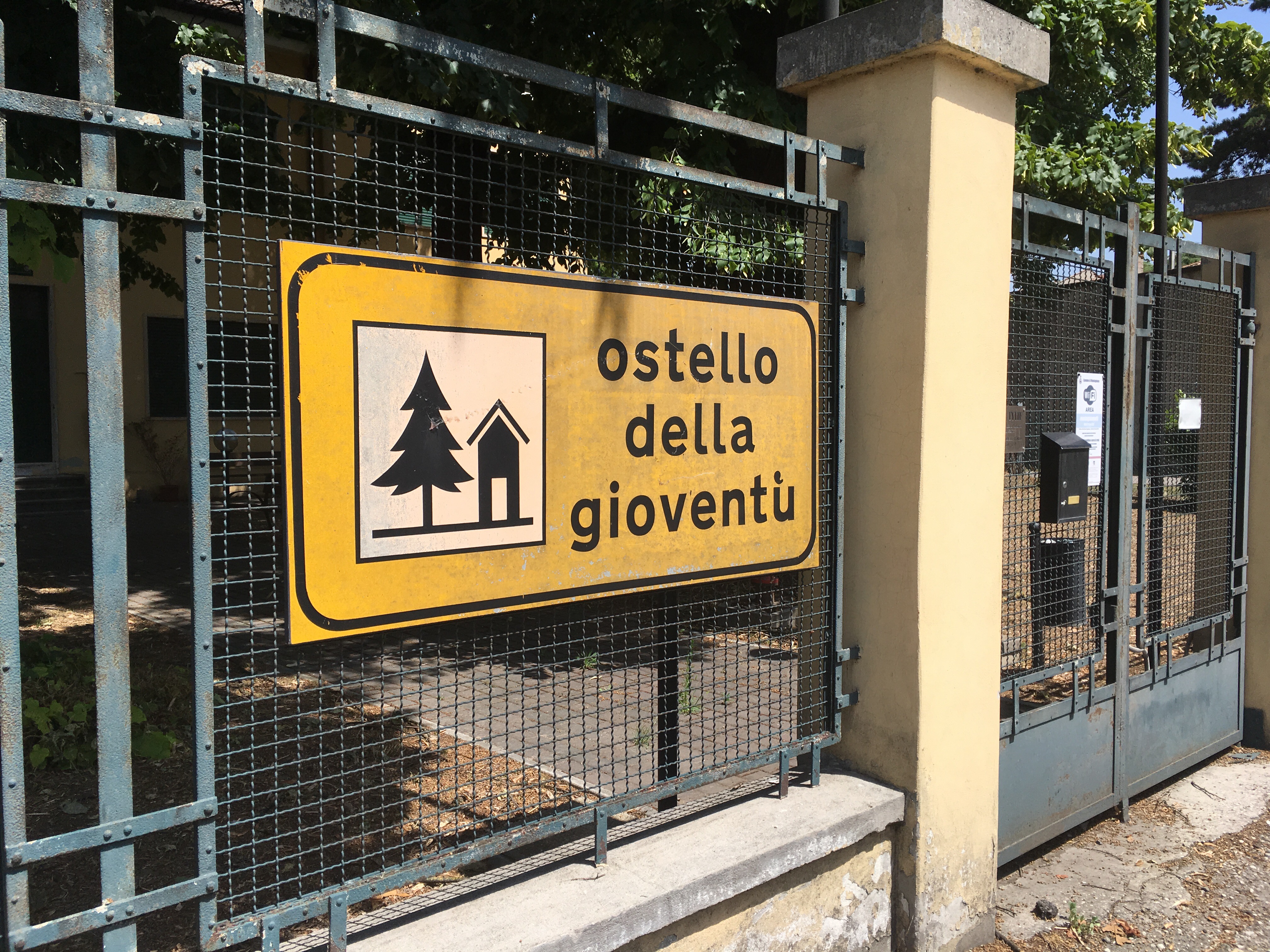 The youth hostel was actually in the tower to the right of the gate and had 4 dormitory rooms above each other, each with 4 sets of bunk beds. There were open metal stairs between the floors which were very steep and fun to negotiate with a heavy rucksack on your back. We had already stayed in an italianate villa in Florence but this was by far the quirkiest place so far! The best bit was that due to the thick walls the inside of the building stayed relatively cool. We spent the couple of evenings we were there sitting under the trees chatting with the other guests.