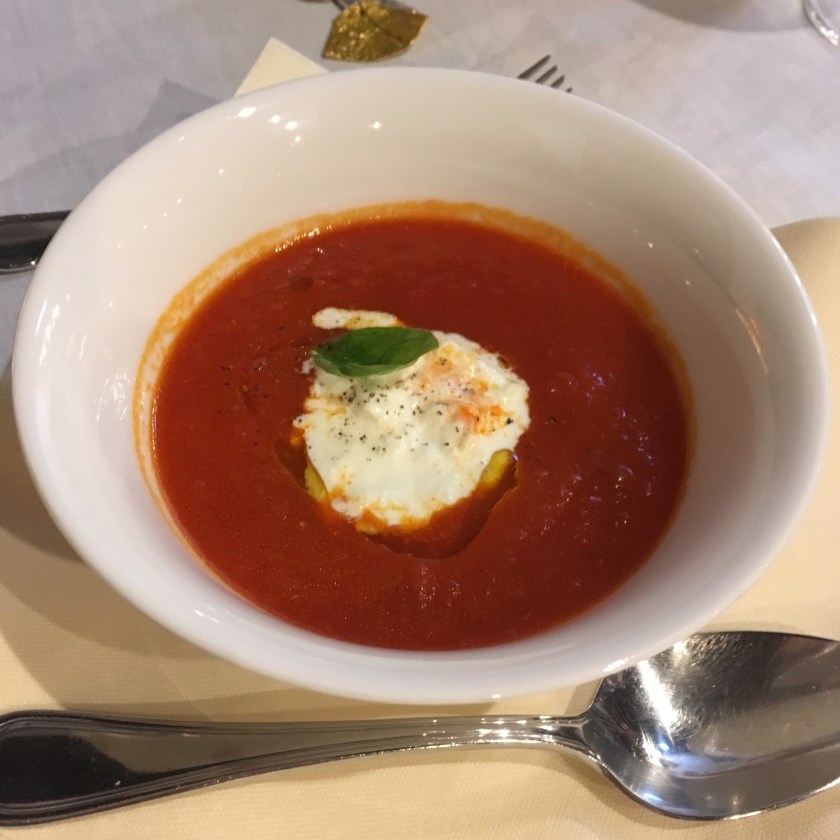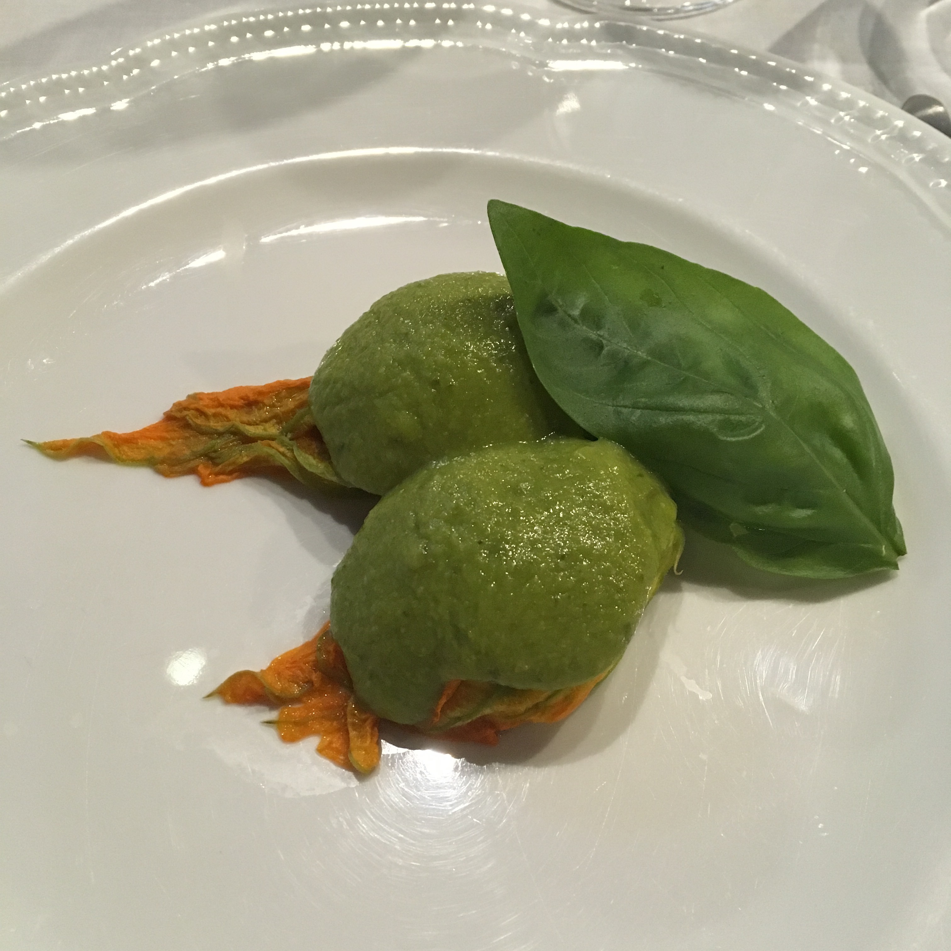 The restaurant had an extensive wine list but no written menu. They recommended as tasting menu but knowing how picky Bethany can be and my aversion to red meat we decided it would be safer to order ourselves. The waiter explained what was on the menu and we chose two courses each. Bethany and Michael went for tomato passata with mozzarella and I went for ricotta stuffed courgette flowers with basil sauce. Both went down very well.
