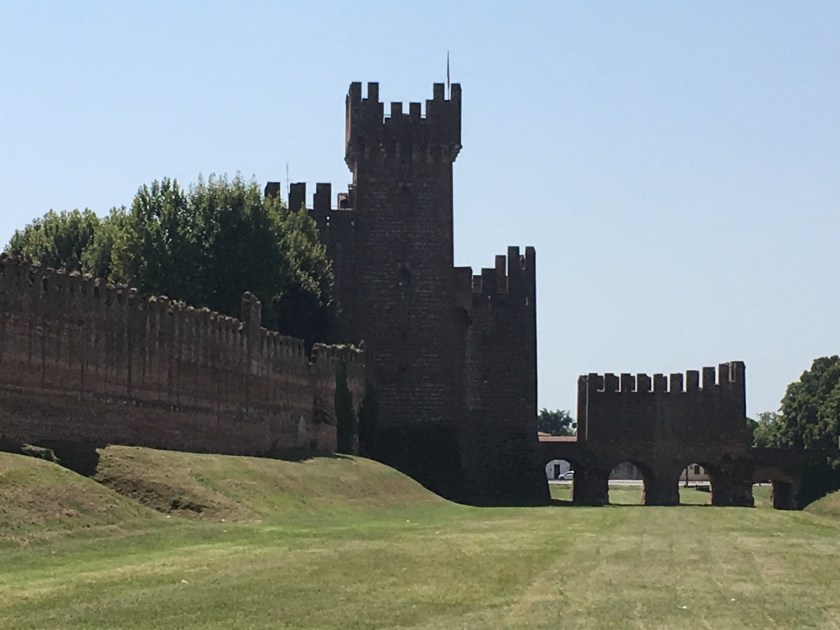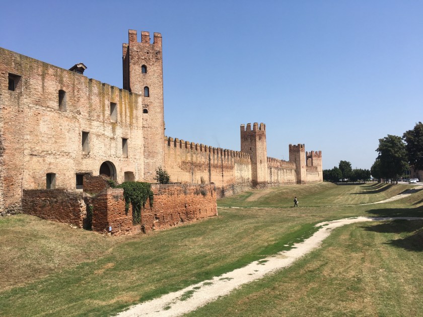 While my university friend, Alona, and I were interrailing during the summer of 1989 we had planned to stay in Venice. Unfortunately Venice had no cheap rooms left and it was recommended that we try Padua. We got back on the train for the 40 minute journey back to Padua. However on arriving in Padua we found there were no beds available at the youth hostel there either. They told us to take the local train to Montagnana, a further 30 minutes from Venice. You have to remember that we had no mobile phones or wifi to check out where we were going. We got off the train at Montagnana in the middle of nowhere and walked towards the imposing walled city.
